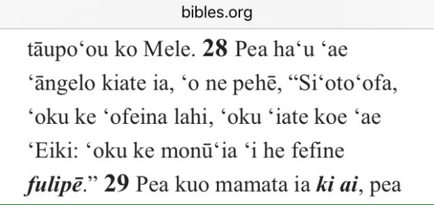 In the Tongan bible Angel Gabriel comes to the Virgin Mary (Luke 1:28) “the angel went to her and said siʻoto ʻofa you who are higly favoured, the lord is with you.” Note there is no mālō e lelei!.